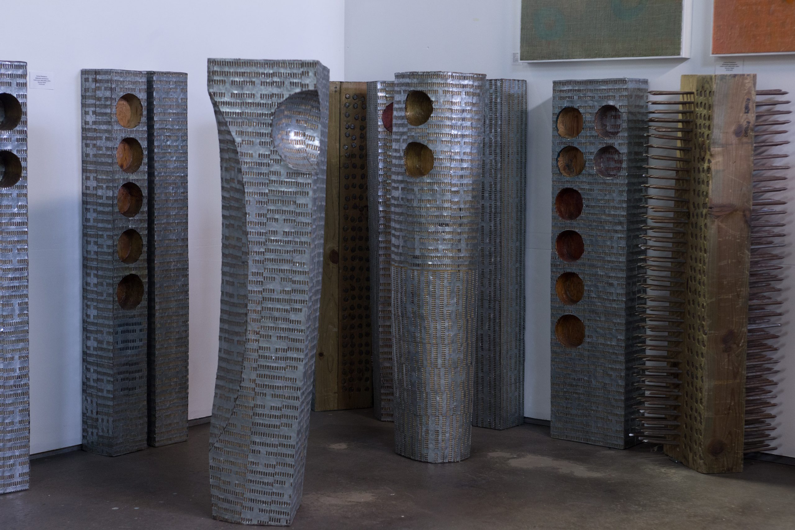 Cultural resistance self defensive mechanism was a thesis exhibition that addresses the nuanced and often painful journey of immigrants striving for integration into American culture while grappling with a sense of alienation and resistance to cultural assimilation. I used wooden blocks, nailing plates, and spikes to symbolize the internal and external conflicts that many immigrant faces as they navigate new social and cultural belonging while trying to preserve their original identities
