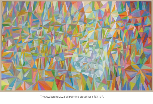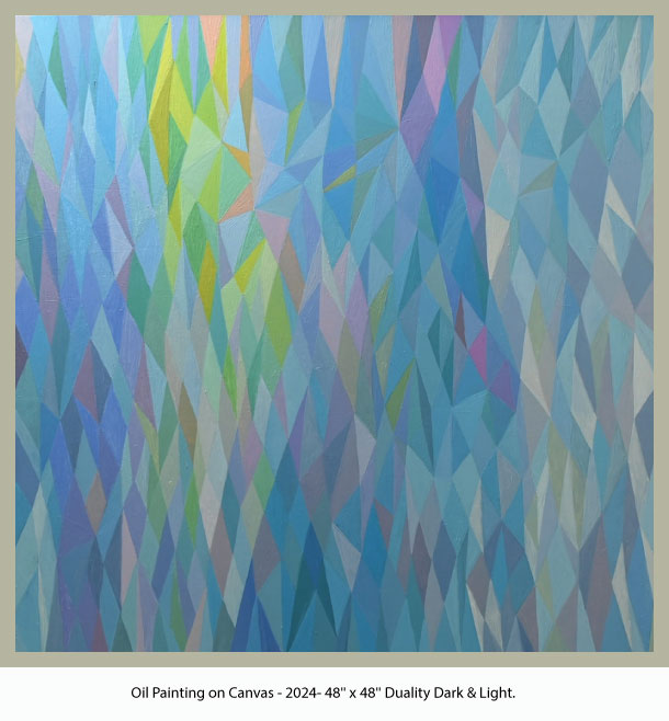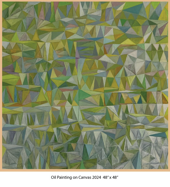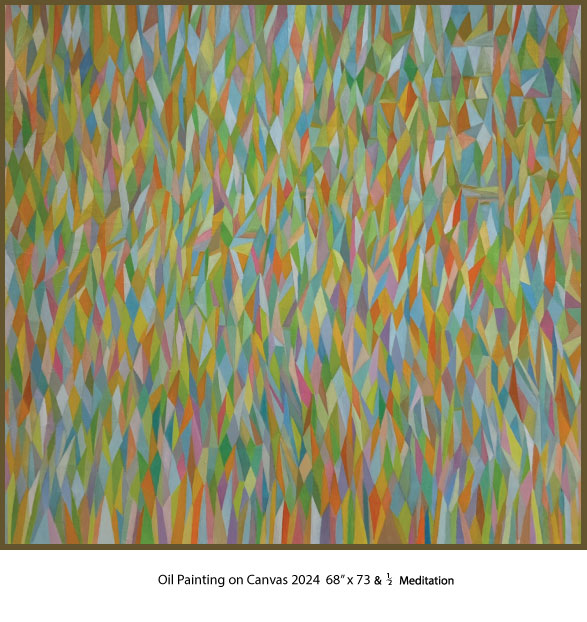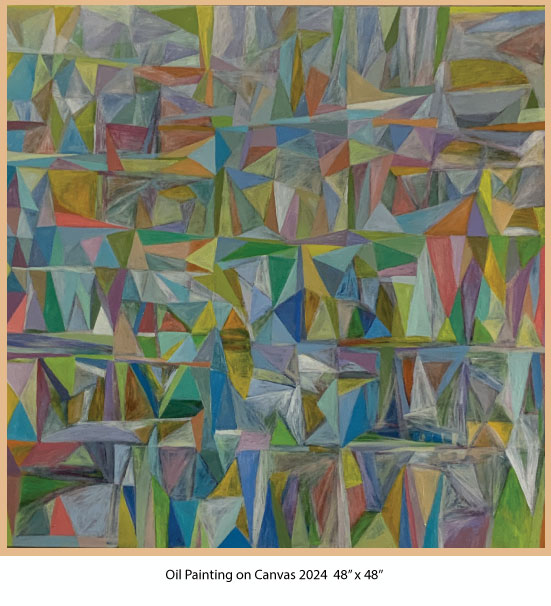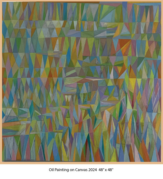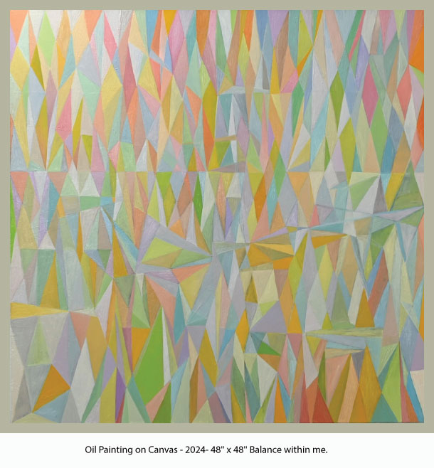 Revered for their symbolism in the spiritual realm, I employ geometric shapes such as triangles and diamonds alongside vibrant lines of color that introduce rhythm and spontaneity. This oil on canvas compositions allow the viewer's eye to dance across the canvas, continuously engaging without an obvious point of focus; each element contributes to equilibrium of the whole. In some works, the choice of colors is soft and subdued, creating an atmosphere of calmness...